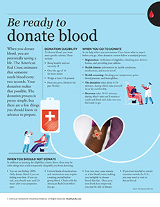 * Certain kinds of medications and vaccinations may require a waiting period before giving blood. Check with the American Red Cross before you go.