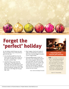 * Look ahead. Many people dread the holiday season. They feel pressured to have perfect parties and gifts. But, it’s just a few weeks out of the year. If something doesn’t go perfectly, remember that it will pass. Focus on the things that have gone right today.
