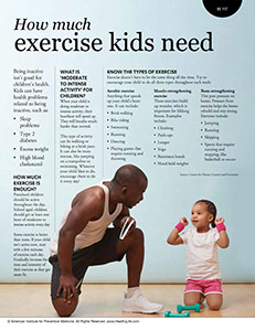 Preschool children should be active throughout the day. School aged children should get at least one hour of moderate to intense activity every day. Some exercise is better than none. If your child isn’t active now, start with a few minutes of exercise each day. Gradually increase the time and intensity of their exercise as they get more fit.