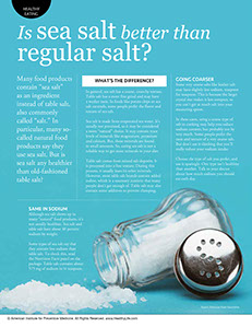 Although sea salt shows up in many “natural” food products, it’s not usually healthier. Sea salt and table salt have about 40 percent sodium by weight.