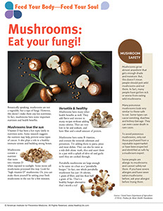 Mushrooms have some B vitamins, and contain the minerals selenium and potassium. Try adding them to pasta, pizza and meat dishes. They can also be eaten as a side dish alone: wash, slice and sauté them in a pan with a splash of olive oil and garlic until they are cooked through.