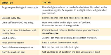 * Don’t smoke. If you do, quit. Limit or don’t have alcohol, sedatives, or a heavy meal within 3 hours of bedtime.