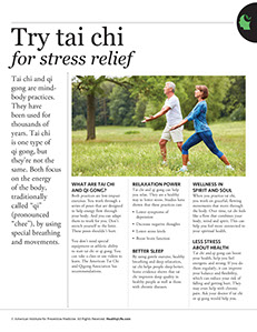 Tai chi and qi gong can help you relax. They are a healthy way to lower stress. Studies have shown that these practices can: