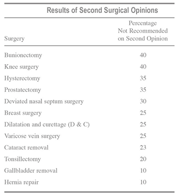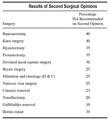 The following table indicates the percentage of surgeries not recommended by the physician giving a second opinion.