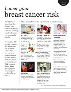 You may be able to make changes that lower your risk of breast cancer. Also, you can have screenings done to catch it early, when it is easier to treat and cure. Talk with your doctor about getting regular mammograms to detect breast cancer.