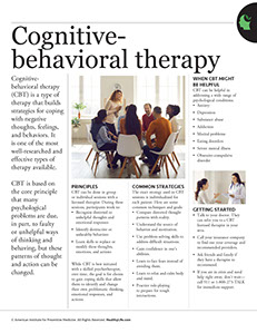 * Talk to your doctor. They can refer you to a CBT licensed therapist in your area.