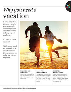You deserve a break. In fact, doctors recommend it. Vacations are good for your health and happiness. Planning ahead, packing smart, and knowing about your destination will help you relax and enjoy.