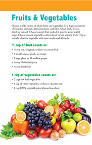 Choose a wide variety of whole fruits and vegetables for a huge assortment of vitamins, minerals, phytochemicals, and fiber. Select fresh, frozen, dried, or canned. Choose canned fruit packed in juice to avoid added sugar. Choose canned vegetables with reduced or low sodium levels. Try to include a fruit or vegetable with most snacks and all meals.
