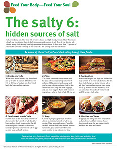 Salt, or sodium, can affect your risk of heart disease and high blood pressure. Many Americans already eat much more than the daily recommended amount of salt. Even if you skip the salt shaker, many foods already have high amounts of salt in them. In fact, more than 75 percent of the salt we consume is already in our foods. It’s not coming from the salt shaker! Be aware of these “salty 6” and start eating less of these foods: