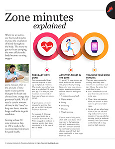 Zone minutes refer to the amount of time spent in any activity that gets the heart rate elevated into a range that promotes health. We all need a certain amount of time in the “zone” to keep our heart, muscles, lungs, and brain in peak condition.